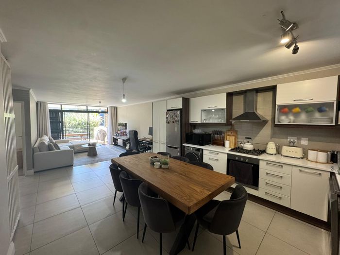 Top-floor Rugby apartment in a secure block, large windows framing Table Mountain, sunlit open-plan living and kitchen, close to transport, shops and schools — 2 beds, 1 bath.