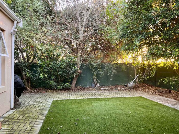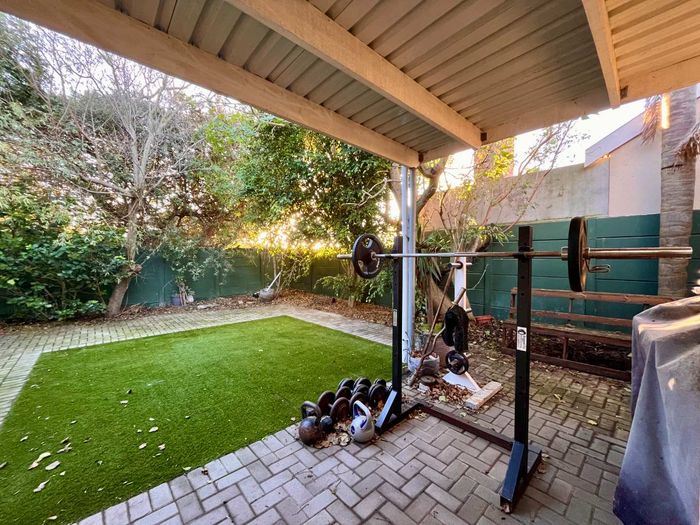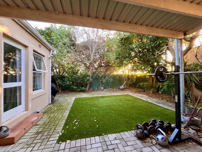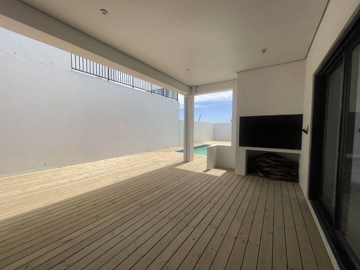 Effortless indoor–outdoor entertaining on wooden decking and heated pool in Sandown Security Enclave, opposite a new park — off-grid solar, underfloor heating and Table Mountain views.