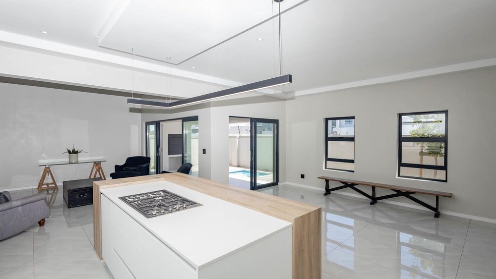 Large sliding doors open onto a private outdoor entertainment area, featuring a splash pool and built-in braai, perfect for hosting gatherings or unwinding in style.