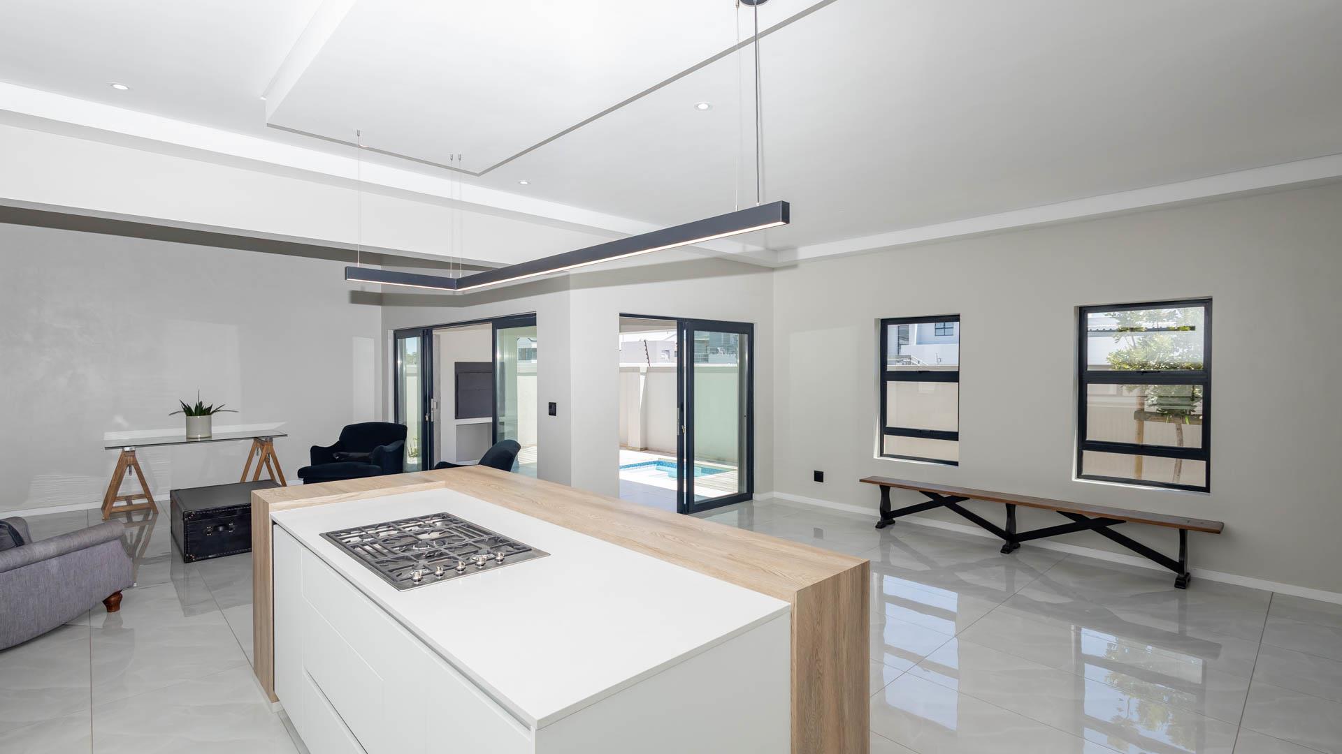The sleek kitchen island serves as a central feature, complete with a built-in gas cooktop, ideal for effortless meal preparation.