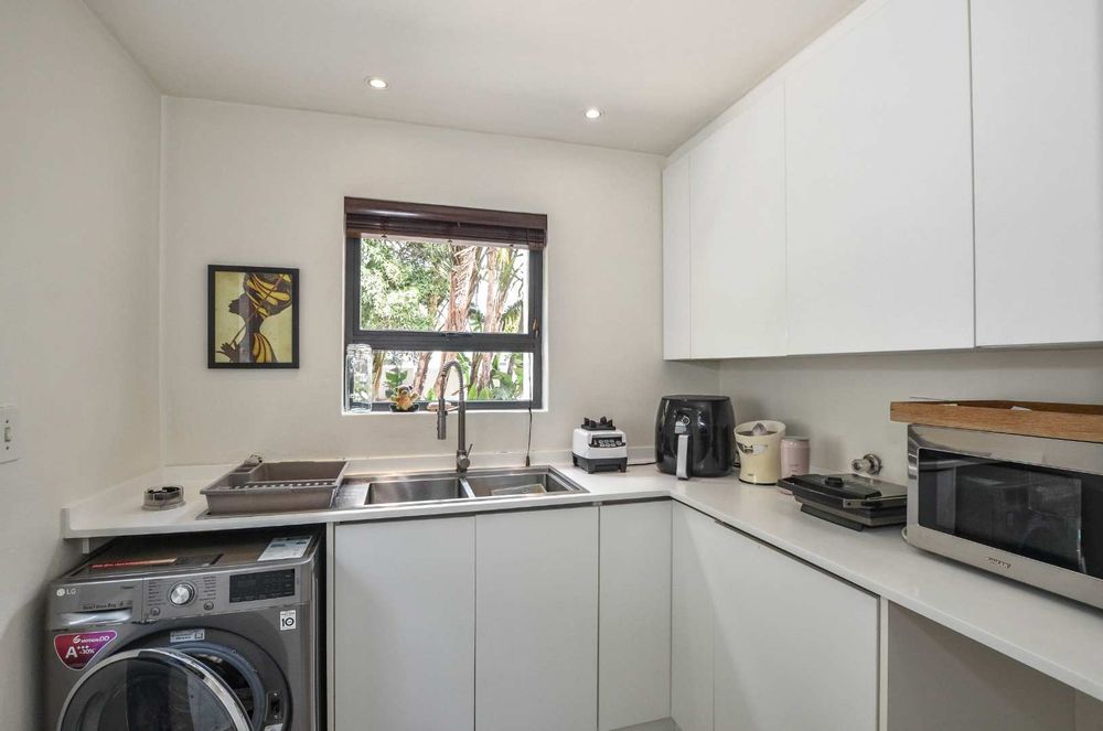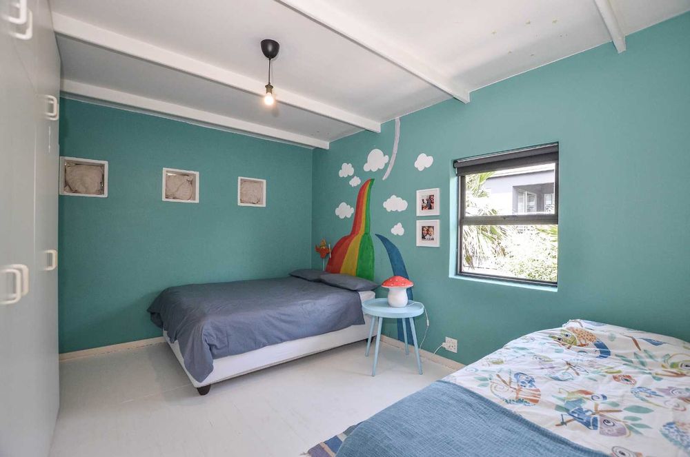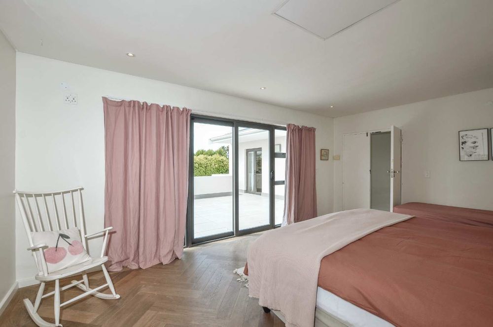 The main en-suite bedroom is a private suite, featuring a generous walk-through dressing room and a bathroom with a natural ambience. Large windows and a walk-in shower provide stunning views of Table Mountain. A north-facing balcony offers the perfect spot to unwind and enjoy serene garden views.