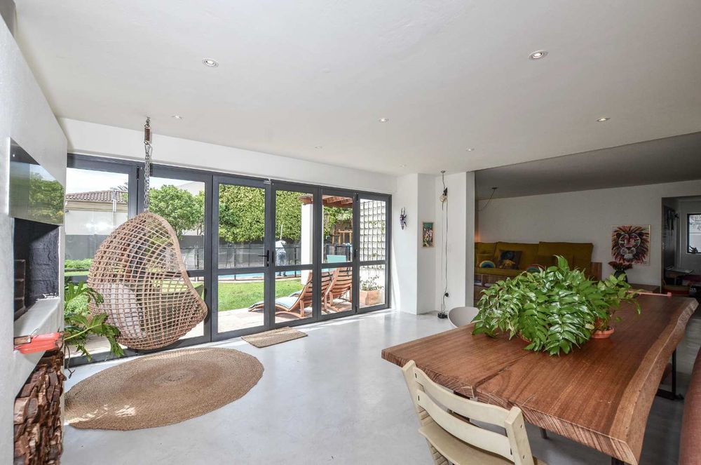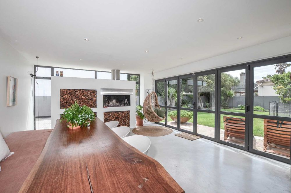 A striking double-volume entrance leads into the heart of the home – a spacious open-plan kitchen and dining area that flows into a large, sunlit lounge with a built-in wood-burning fireplace and stacking doors opening onto a lush, private garden. There is a large dining room with views of the garden and pool as well. A separate playroom to the right of the kitchen offers flexibility as a potential fifth bedroom, and an additional large room is ideal as a home gym, studio, or storage space for surf and kite gear.