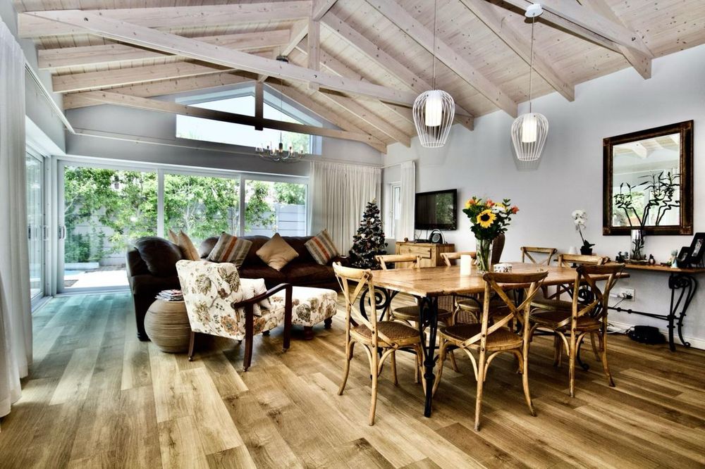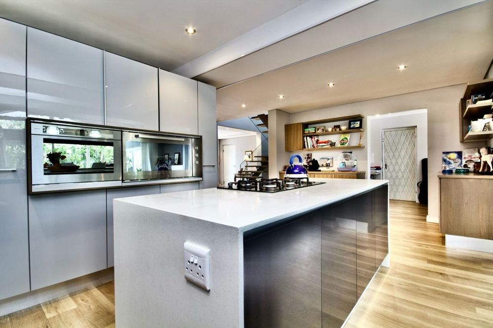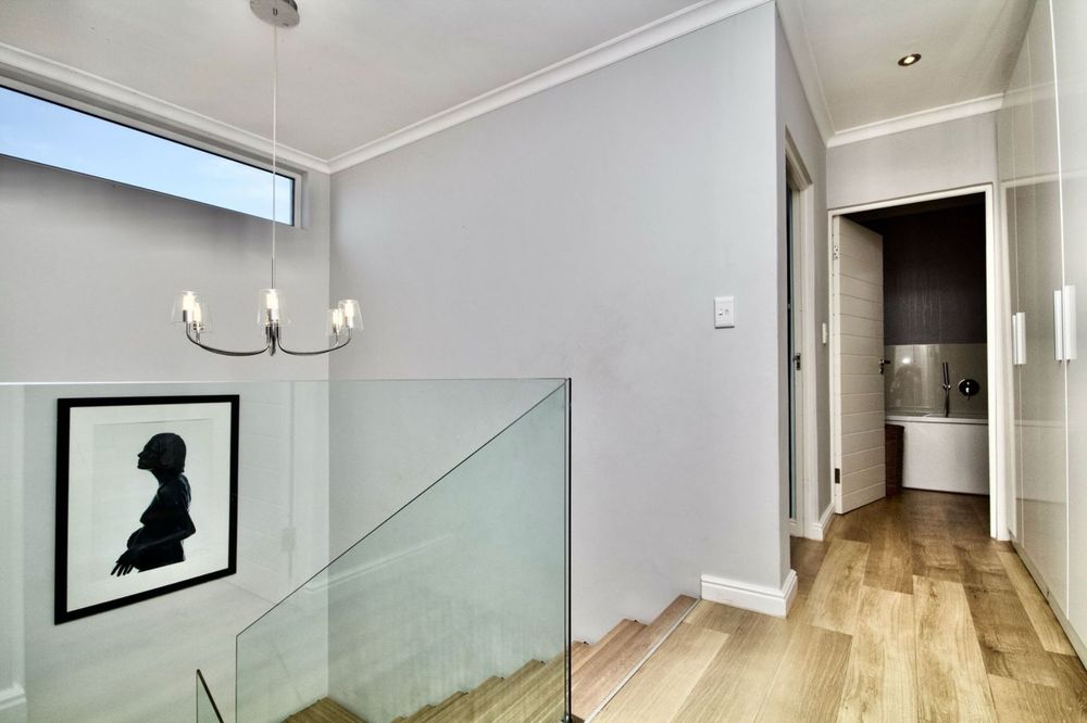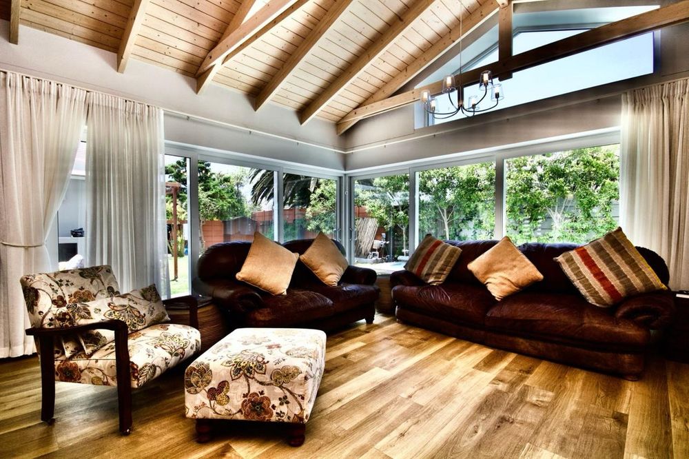 Unique architecturally designed home, tranquil and modern with its exposed trusses and natural colours and wooden flooring throughout. It’s the perfect sea side home with clean, modern and sleek finishes. The home is fully walled offering great security and safety for kids and pets. The large foyer leads to a floating wooden staircase and the living area is open flow linked to a modern slim lined, sophisticated and sleek kitchen, with every catering need taken care of through modern oven and secluded scullery. Great morning light entry through east facing windows. The European feeling is continued with the double glazing windows and doors, generously placed throughout which leads to the private garden. 4th guest bedroom en-suite downstairs off the foyer allows for private guest accommodation. There is a large study with 2 work stations linking the house to a very large flat with private entrance. The large garden features an undercover barbecue area off the living areas, underneath aluminium awning which can open or close for sun factor. Jacuzzi as well as swimming pool set in Balau decking finishes off the outside area. Double garage, as well as the potential of 3 cars off street, is accommodated behind the automated driveway gate.