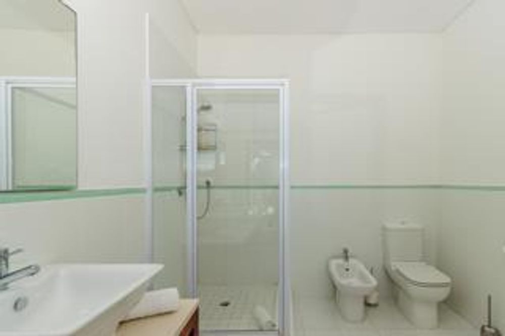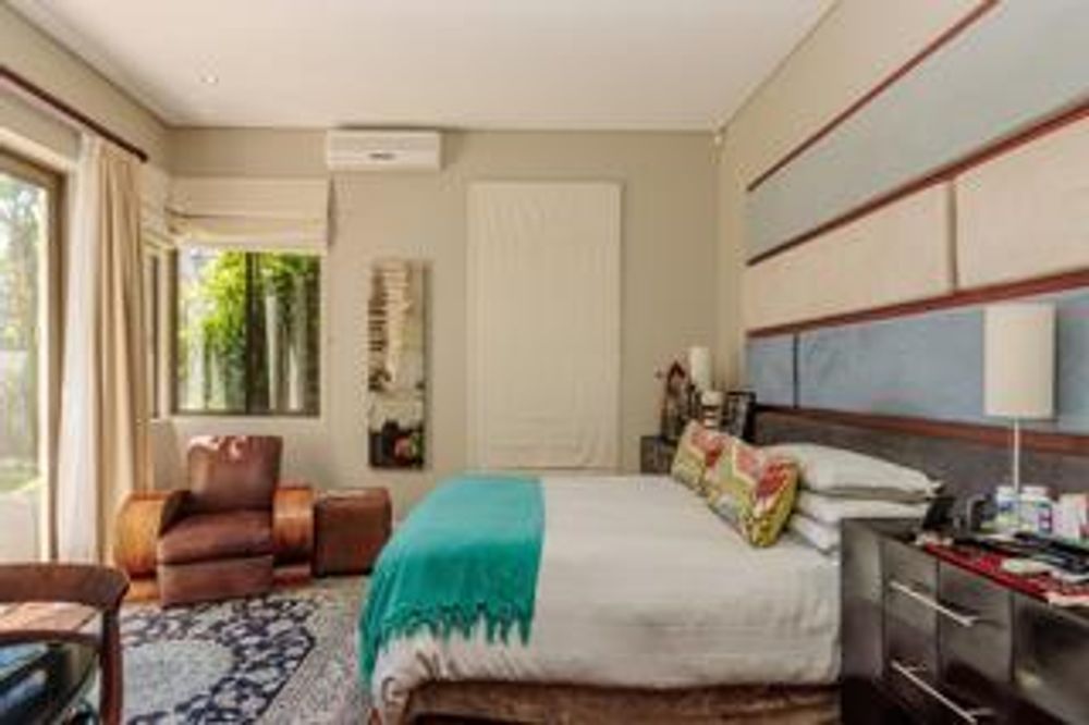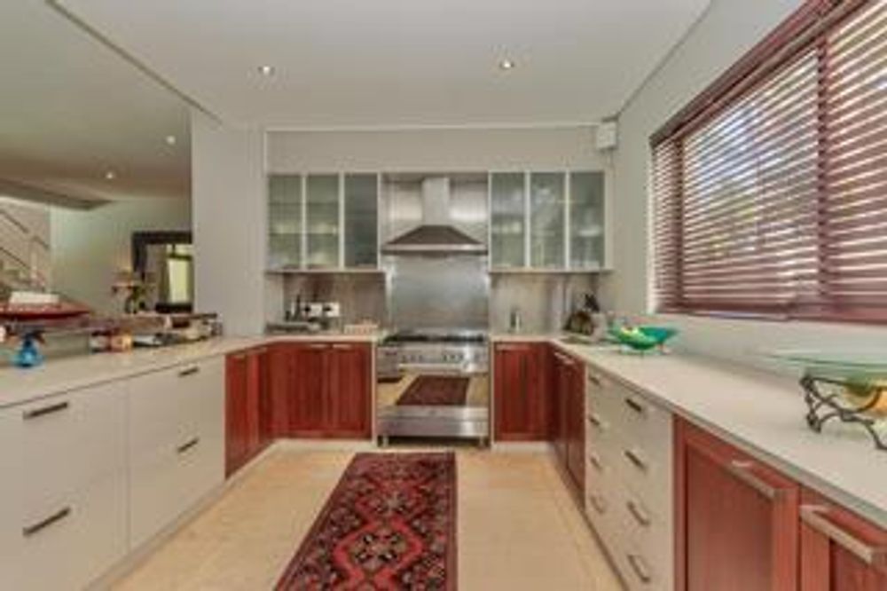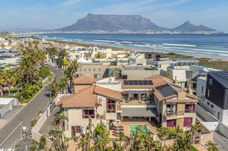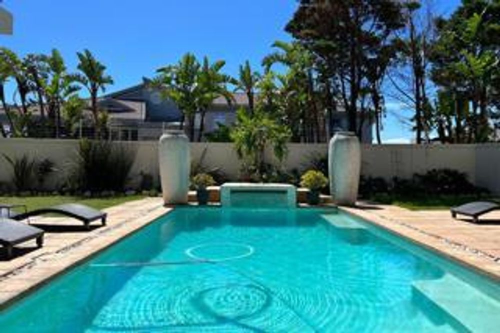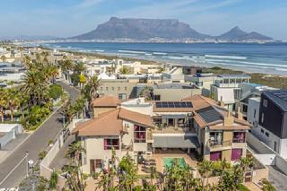 The garden is sunny and spacious, with a beautiful cascading solar heated pool. The home also offers excellent parking. A double garage and off-street parking for eight vehicles complete the property. The beach is a few steps away, world-renowned for kite surfing and exquisite Table Mountain views.