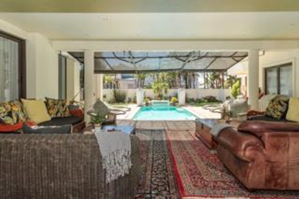 A large lounge with a gas fire place, sliding open to the pool area
