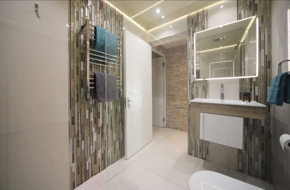 Renovated bathroom consisting of a large walk-in-shower an overhead Hansgrohe rainfall showerhead mounted into the ceiling, as well as a wall-mounted sports showerhead with three pulse/pressure settings, The shower mixer has a 2 button touch control sensor, thermostatic control to ensure the water temperature plus heated towel rail (oil-filled heated rail and low electric consumption) to ensure towels are always dry and warm after showering, quality gerbera towel installed with quality Laufer toilet bowel, a Hansgrohe touch basin tap and an Italtile designer bathroom console.