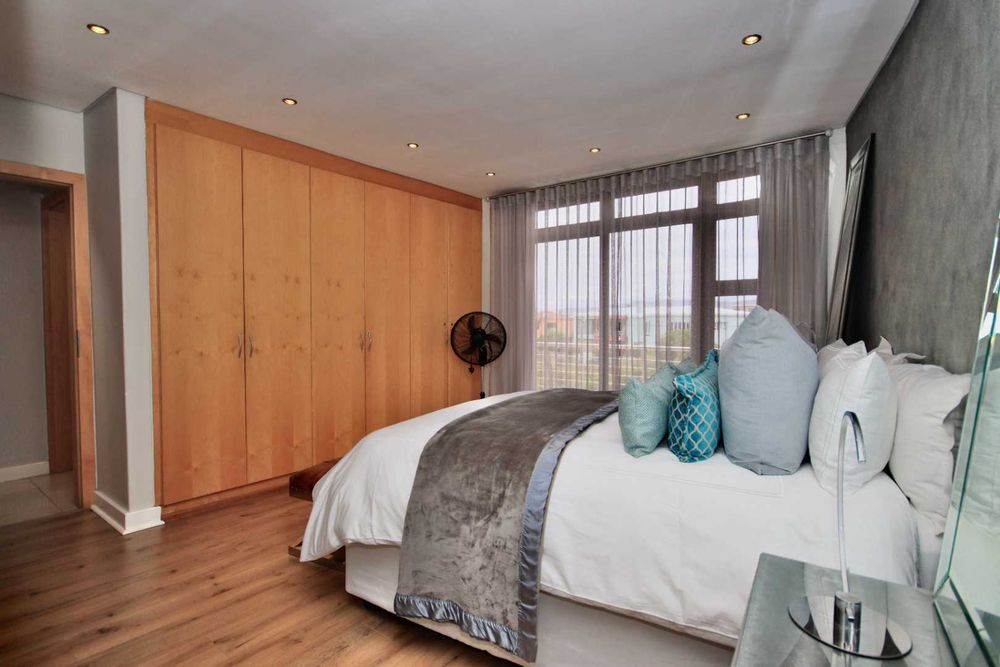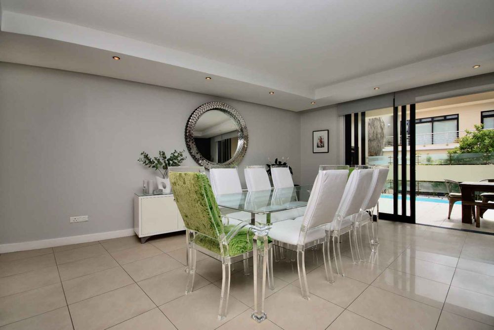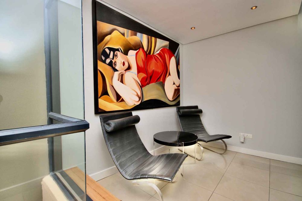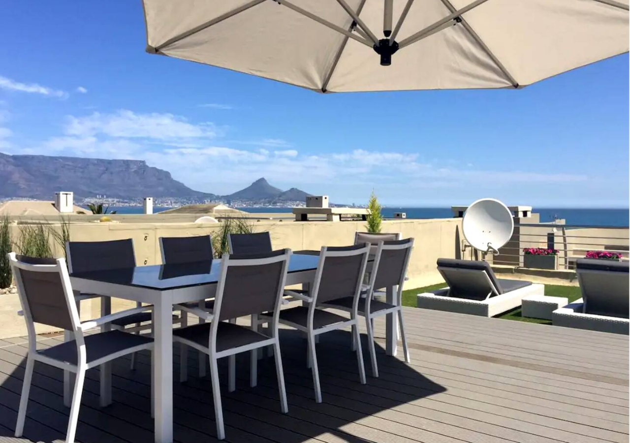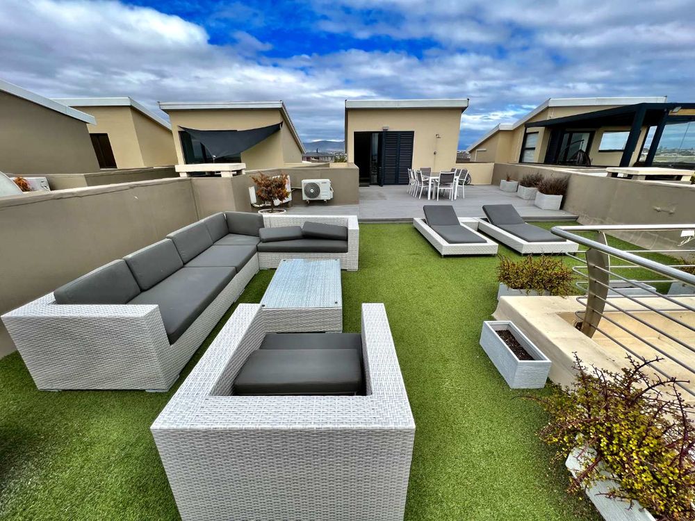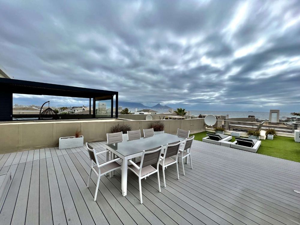 The living areas include a dining room and TV room that are open plan, creating a bright and spacious atmosphere. Living area opens to splash pool. Lots of light provided from small courtyard garden. The built-in braai and gas fireplace are perfect for entertaining guests or spending cozy evenings at home. The kitchen is equipped with a wash-up area and all the necessary appliances to make cooking a breeze. For even more stunning views, head up to the rooftop deck with a bar area, where you can soak up the sight of Table Mountain and the ocean.