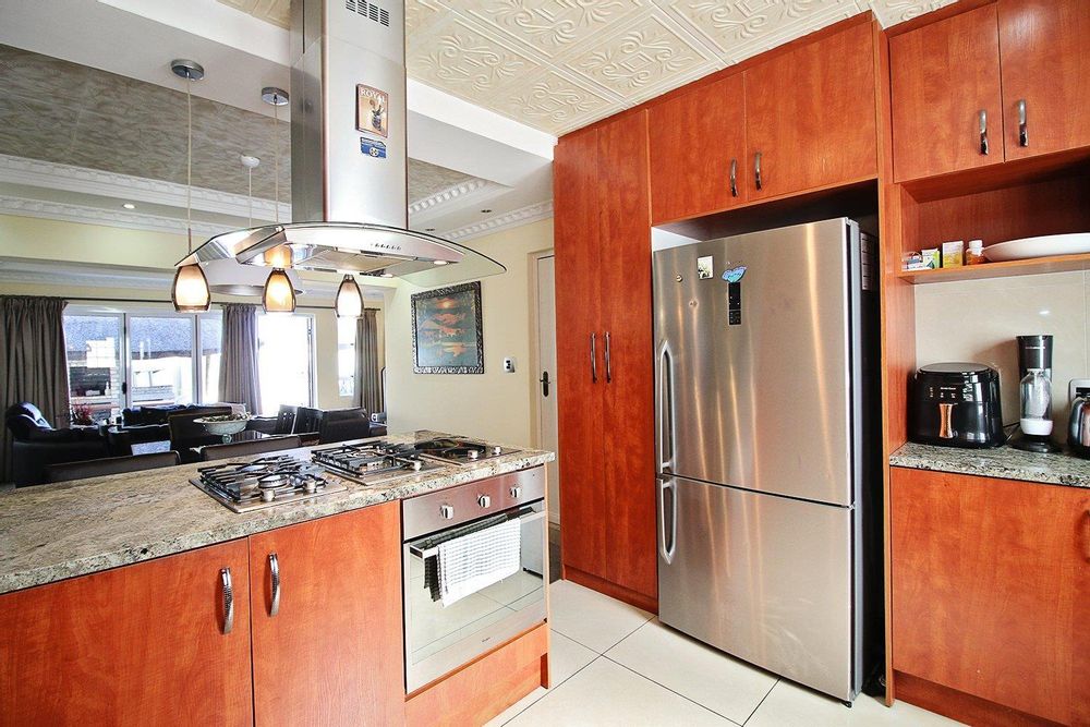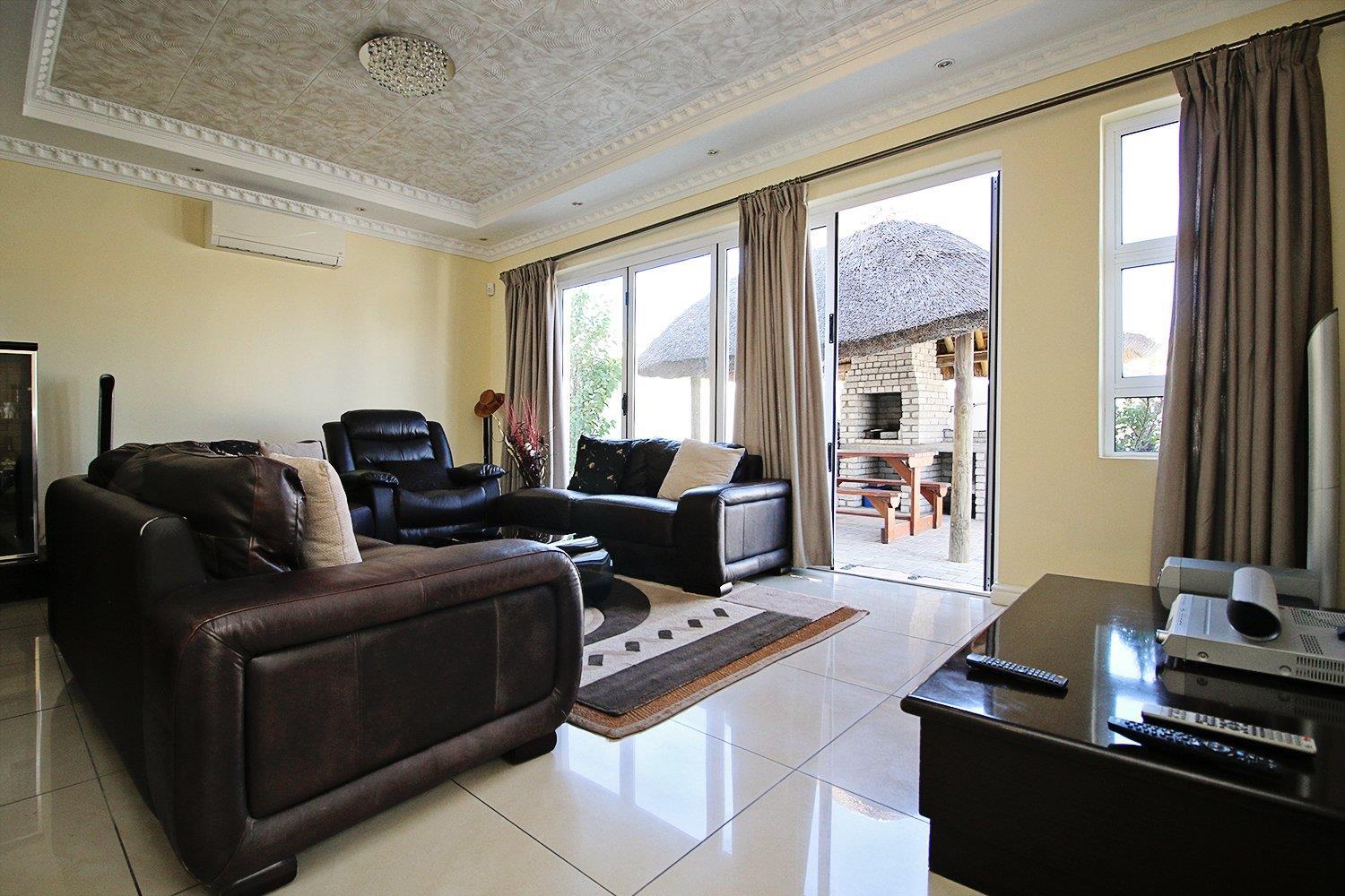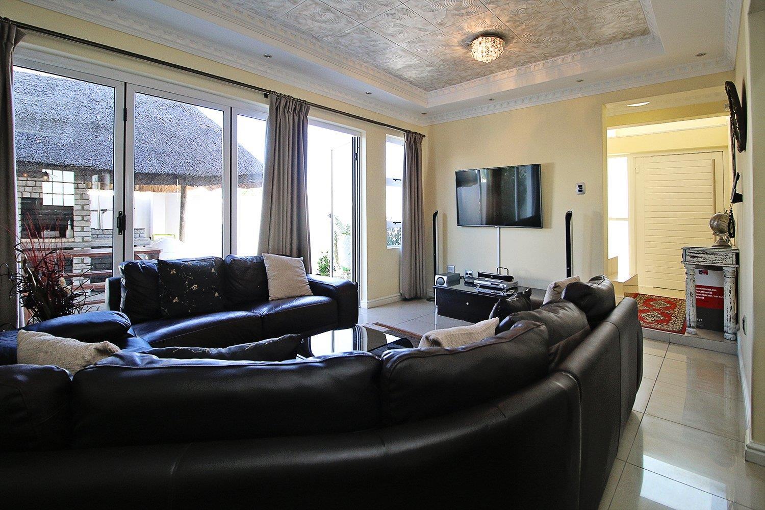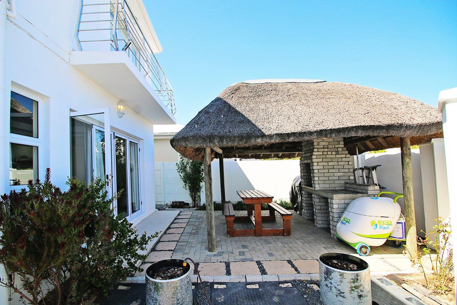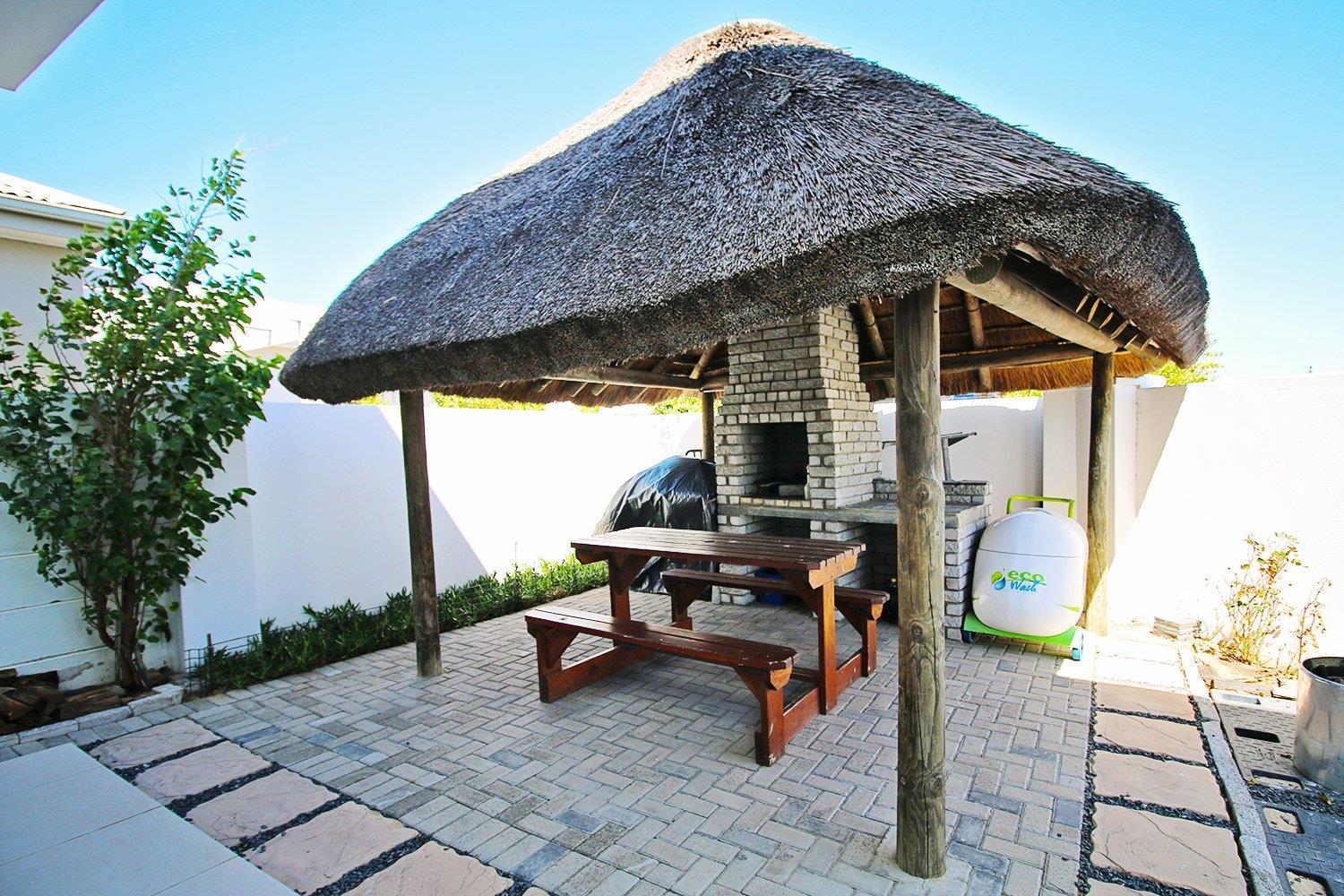 Downstairs, be greeted by a fully-fitted kitchen that effortlessly combines style and practicality, boasting both gas and electric hobs, an electric oven, and a sleek stainless steel extractor fan. Plumbed for one appliance, it seamlessly connects to the tiled open-plan dining and lounge area. But that's not all – step through stacking doors to a paved entertainment area featuring a charming thatched lapa and a built-in braai, creating the perfect backdrop for hosting outdoor gatherings. And for those yearning for a pool, fear not—plans are already approved! Guest bathroom for practicality, air conditioning, fiber connectivity, and a top-notch alarm system. The double garage, considerately plumbed for a second appliance, provides direct access into the home, while another secure parking area awaits behind gates.