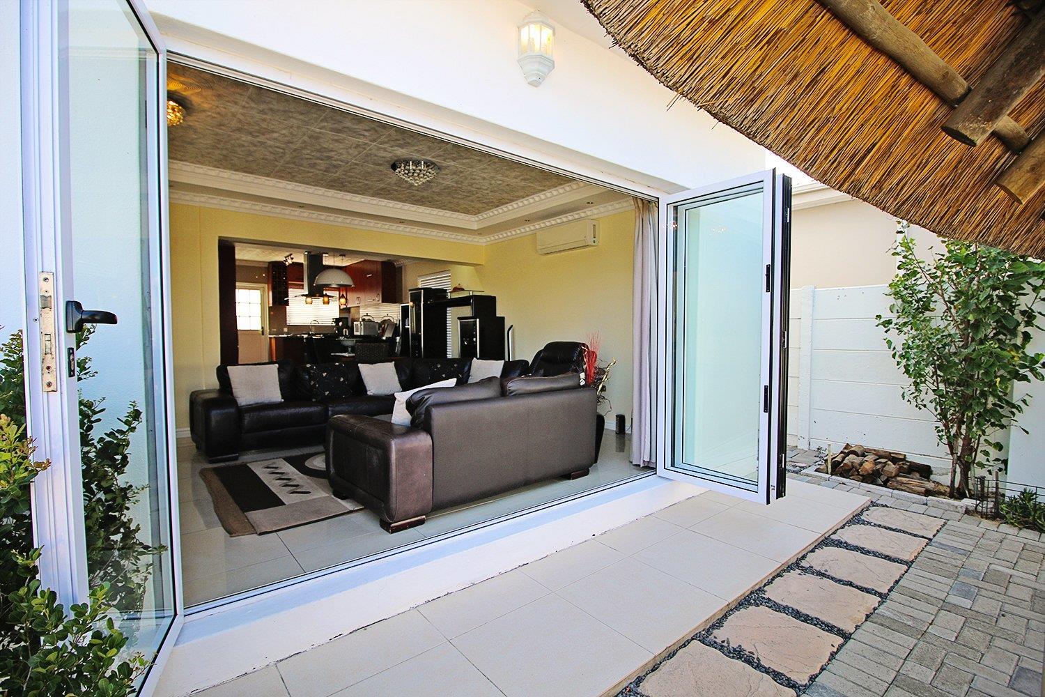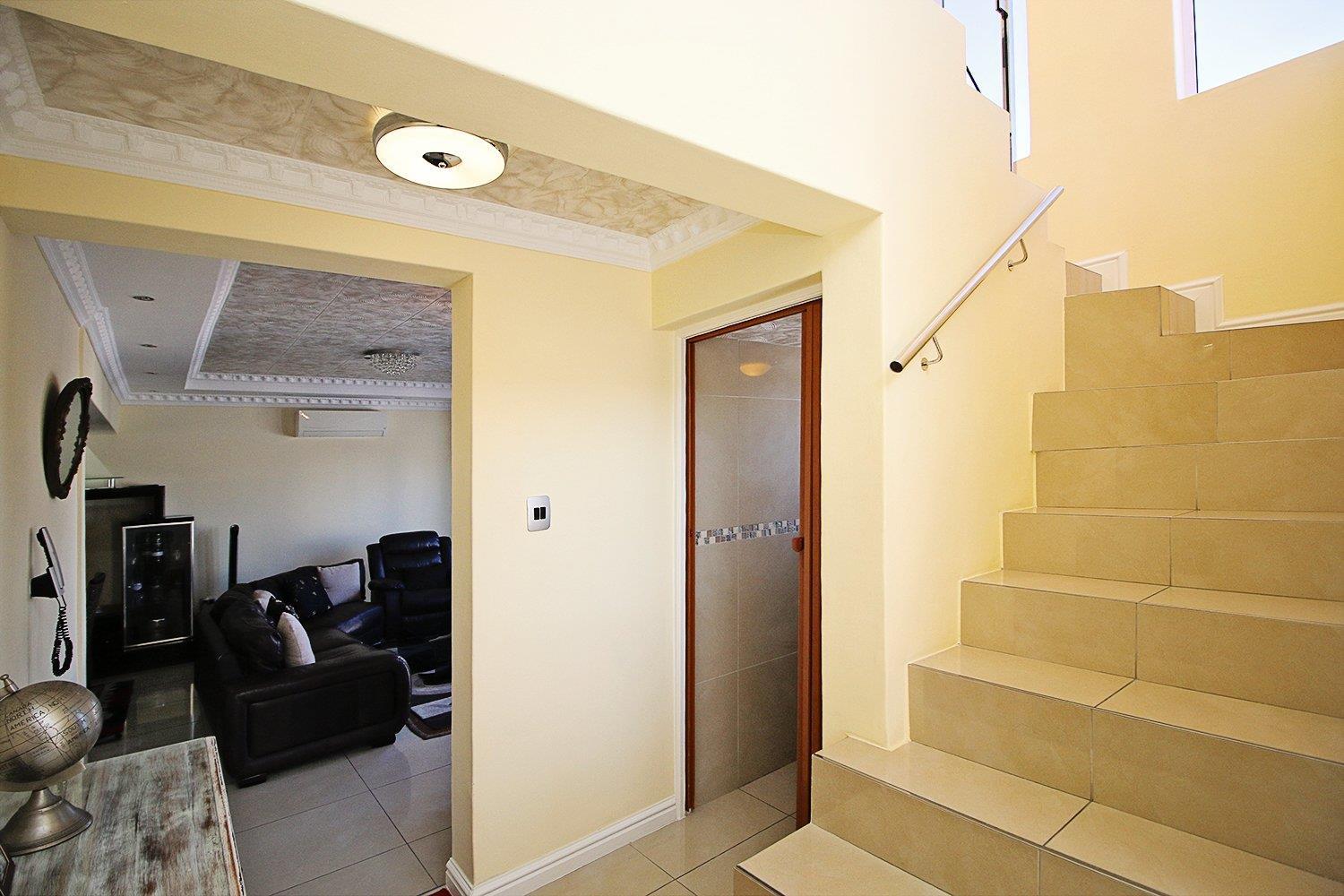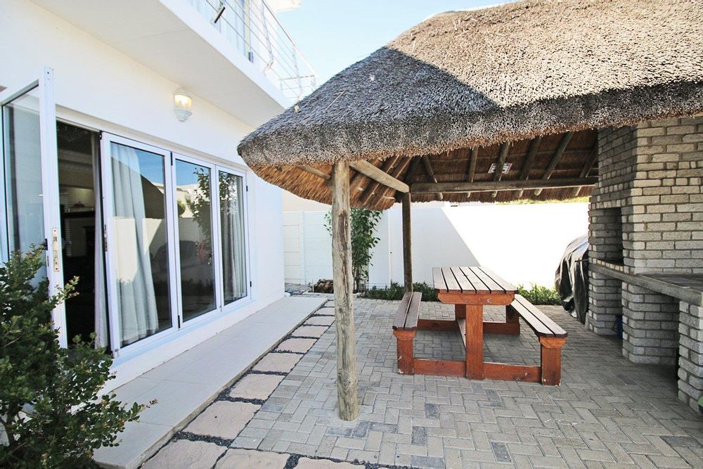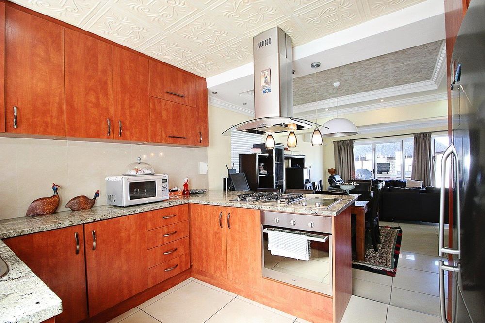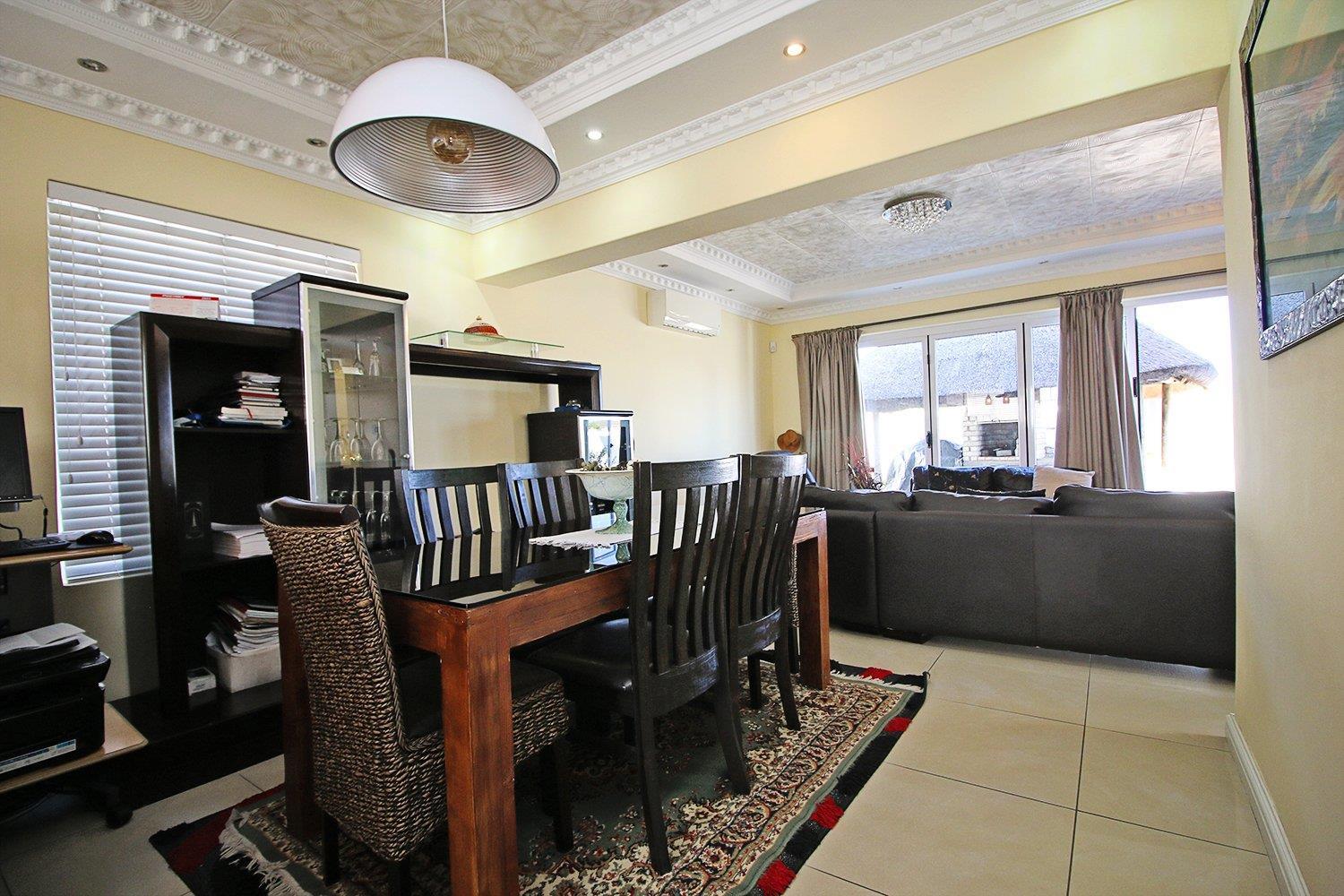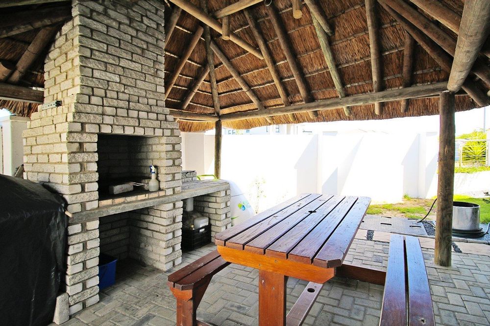 Downstairs, be greeted by a fully-fitted kitchen that effortlessly combines style and practicality, boasting both gas and electric hobs, an electric oven, and a sleek stainless steel extractor fan. Plumbed for one appliance, it seamlessly connects to the tiled open-plan dining and lounge area. But that's not all – step through stacking doors to a paved entertainment area featuring a charming thatched lapa and a built-in braai, creating the perfect backdrop for hosting outdoor gatherings. And for those yearning for a pool, fear not—plans are already approved! Guest bathroom for practicality, air conditioning, fiber connectivity, and a top-notch alarm system. The double garage, considerately plumbed for a second appliance, provides direct access into the home, while another secure parking area awaits behind gates.