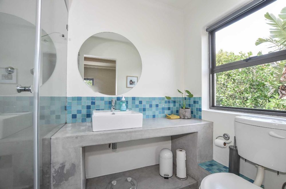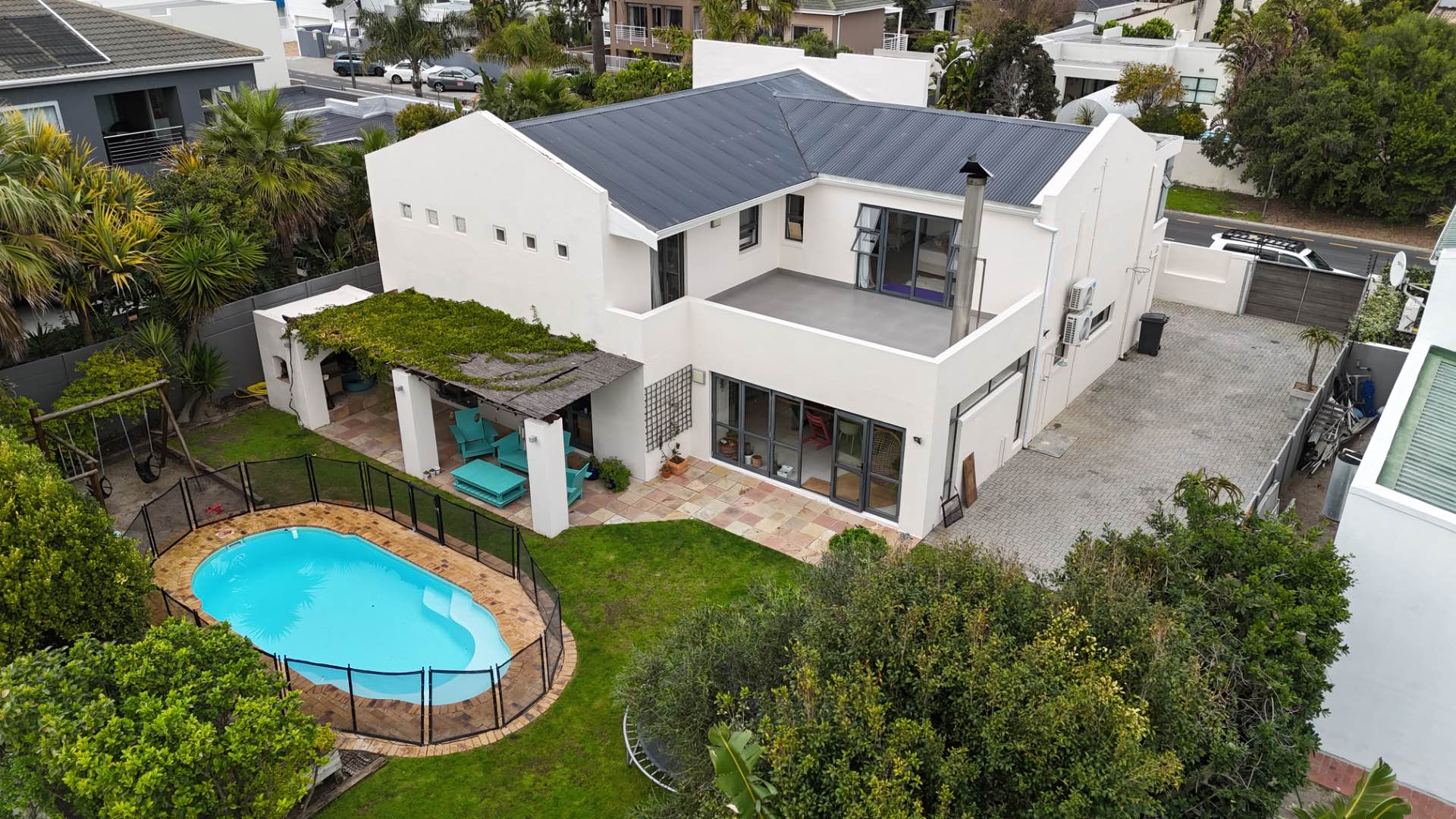 A striking double-volume entrance leads into the heart of the home – a spacious open-plan kitchen and dining area that flows into a large, sunlit lounge with a built-in wood-burning fireplace and stacking doors opening onto a lush, private garden. There is a large dining room with views of the garden and pool as well. A separate playroom to the right of the kitchen offers flexibility as a potential fifth bedroom, and an additional large room is ideal as a home gym, studio, or storage space for surf and kite gear.