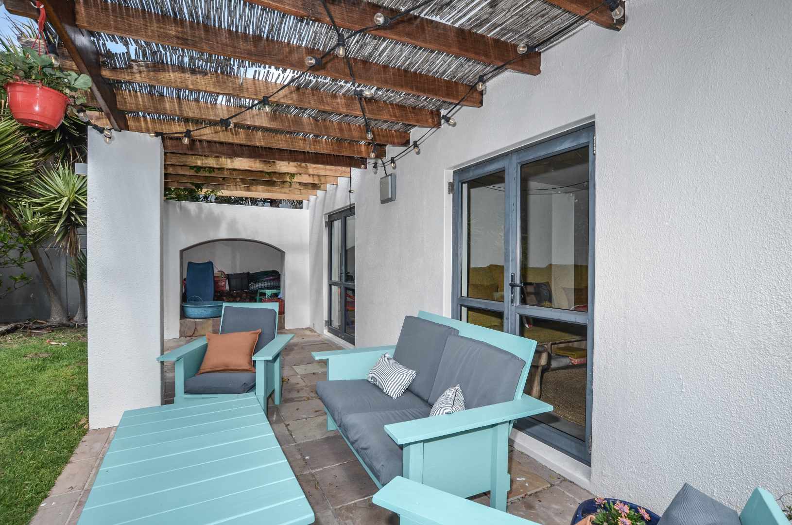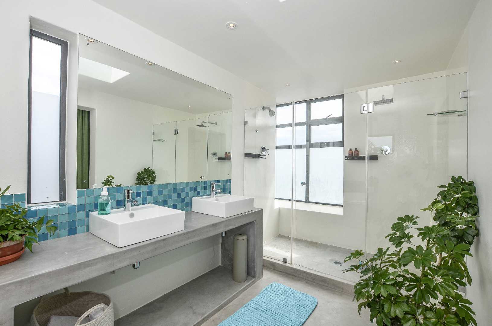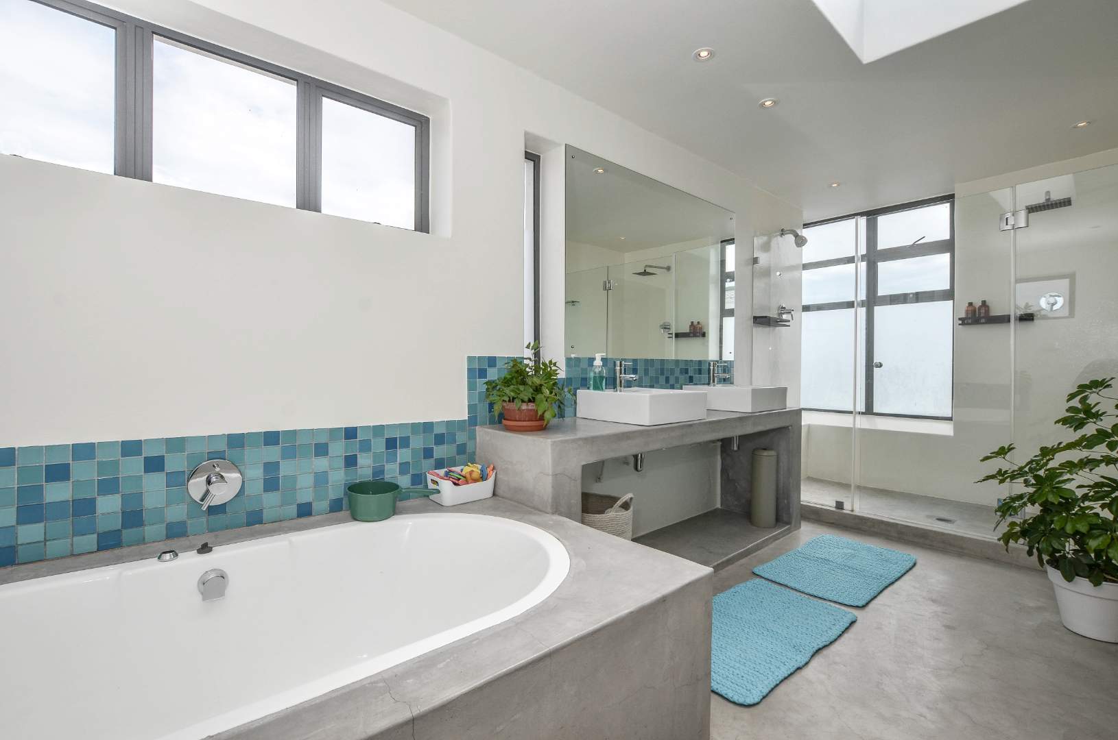 The main en-suite bedroom is a private suite, featuring a generous walk-through dressing room and a bathroom with a natural ambience. Large windows and a walk-in shower provide stunning views of Table Mountain. A north-facing balcony offers the perfect spot to unwind and enjoy serene garden views.