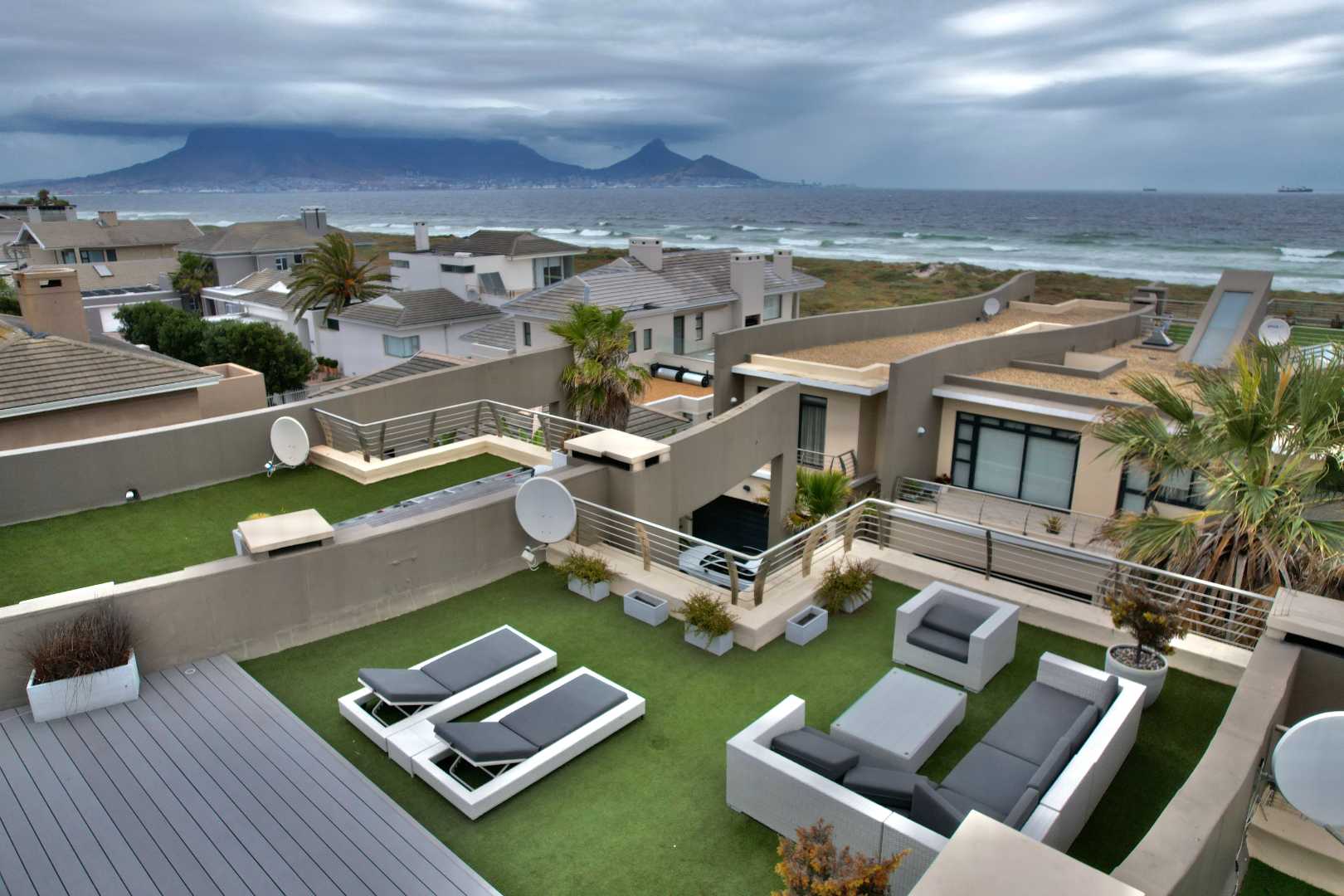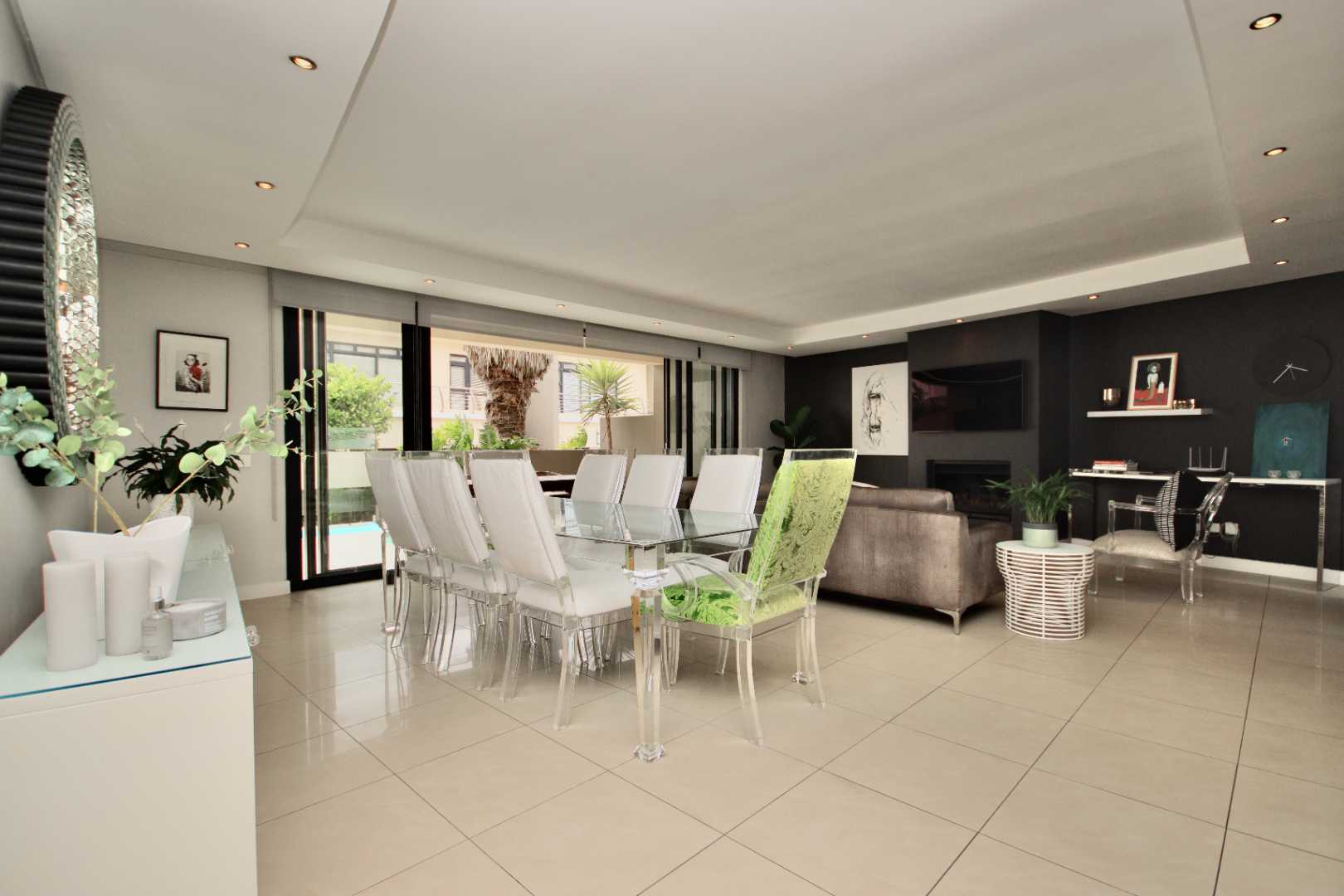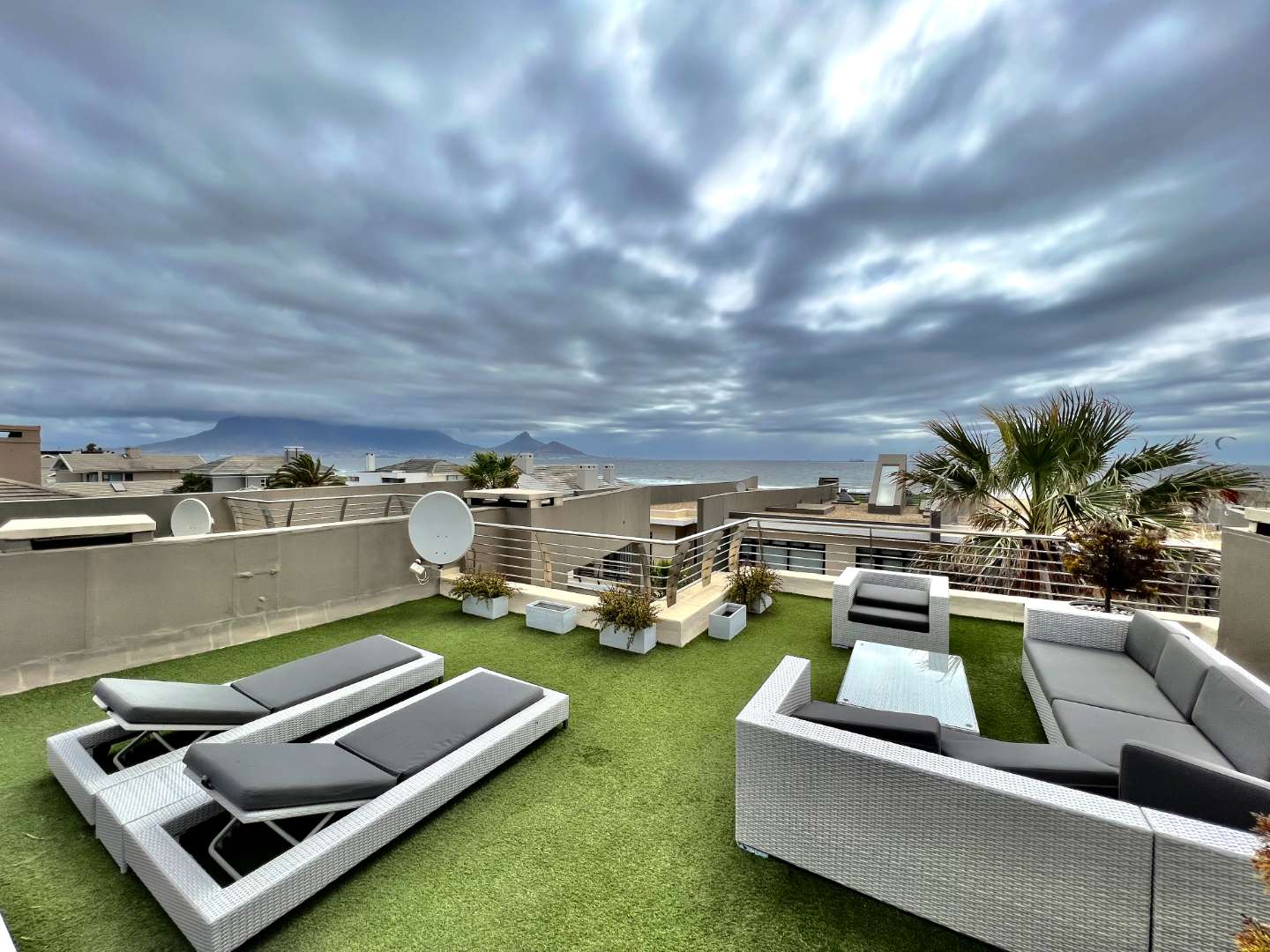 The living areas include a dining room and TV room that are open plan, creating a bright and spacious atmosphere. Living area opens to splash pool. Lots of light provided from small courtyard garden. The built-in braai and gas fireplace are perfect for entertaining guests or spending cozy evenings at home. The kitchen is equipped with a wash-up area and all the necessary appliances to make cooking a breeze. For even more stunning views, head up to the rooftop deck with a bar area, where you can soak up the sight of Table Mountain and the ocean.